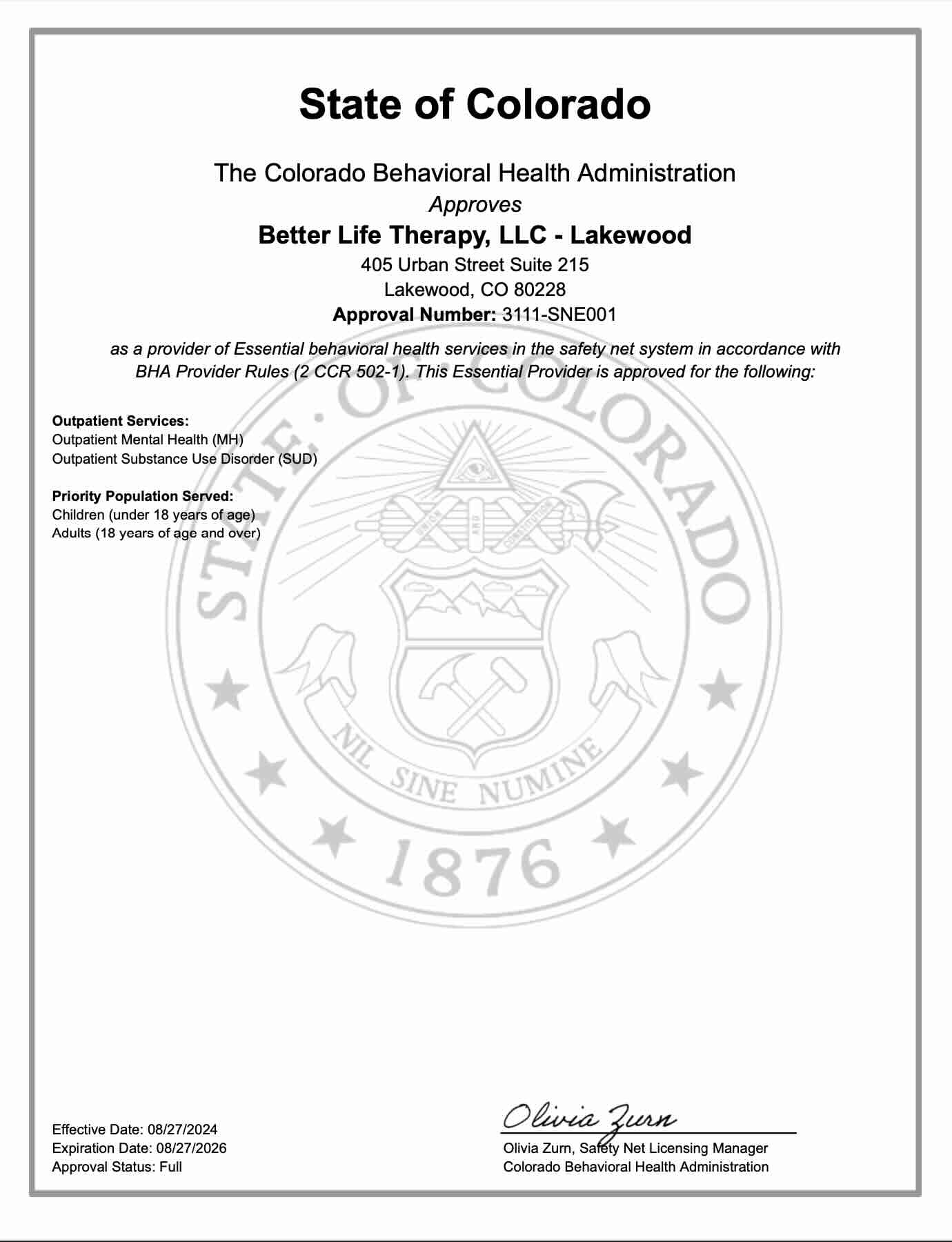 Better Life Therapy ESNP License