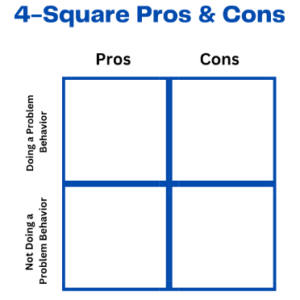 Impulsive behaviors are often associated with attention-deficit/hyperactivity disorder (ADHD), personality disorders (such as borderline personality disorder), or substance use disorders. DBT, or Dialectical Behavior Therapy, is often used to treat impulsive behaviors. DBT works with the “wise mind” which is the middle ground between your “emotional mind” and your “rational/reasonable mind.” By thinking with your “wise mind” we can picture what is true and begin to unlearn thought processes that cause impulsive behaviors. An activity your therapist might do with you would be the Four Square Pros and Cons as laid out below: