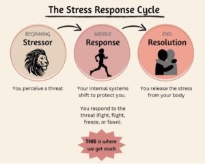 The stress response cycle is here to keep us alive by responding to immediate threats. The only problem is that our modern stressors are typically not life-threatening, yet our bodies react as if they are. So, we have this wonderful system in place to keep us alive, but it is getting activated by things that will not kill us. Our physical safety is not at risk yet our body is filtering these situations as life or death. As such, we need to meet our bodies where they are and help them remember – you are safe now, let’s turn off all the alarms and return to rest.